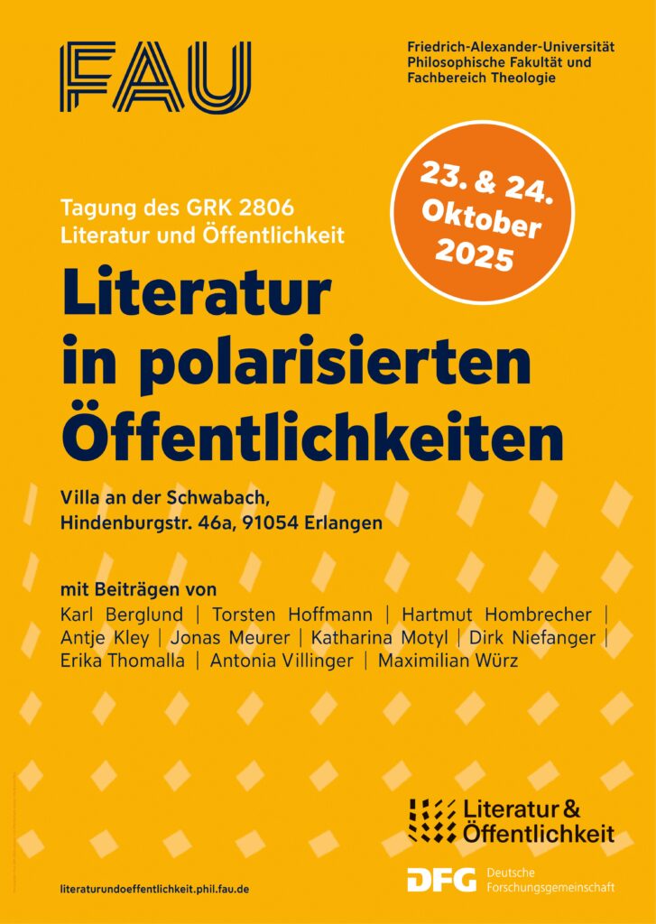 Am 23. und 24. Oktober 2025 findet die vom GRK 2806 organisierte Tagung „Literatur in polarisierten Öffentlichkeiten“ in der Villa an der Schwabach in Erlangen statt. Weitere Informationen finden Sie im Tagungsprogramm.